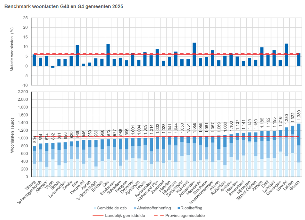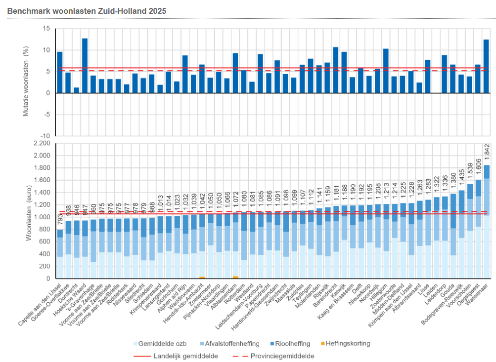 De figuren bieden de mogelijkheid om de gemeenten op verschillende punten te vergelijken. De positie op de x-as (hoe ver naar rechts staat de gemeente?) geeft informatie over de hoogte van de gemeentelijke woonlasten in vergelijking met die van de andere gemeenten in de provincie. De horizontale rode lijnen laten zien in hoeverre de gemeentelijke woonlasten en de mutatie afwijken van het gemiddelde in Nederland (doorgetrokken rode lijn) en de provincie (gestippelde rode lijn). Het gemiddelde voor Nederland bedraagt € 1.052 en voor Zuid-Holland is dit € 1.090. Het stijgingspercentage ten opzichte van 2024 bedraagt landelijk 5,9% en voor Zuid-Holland 5%. Verder kan de hoogte van de ozb, afvalstoffenheffing en rioolheffing worden vergeleken. Enkele gemeenten hanteren een korting op de totale aanslag (heffingskorting). De hoogte van de heffingskorting wordt weergegeven met een oranje balkje. Het bedrag van de heffingskorting is verrekend met de gemiddeld betaalde ozb, de afvalstoffenheffing en de rioolheffing in de gemeente door het gekorte bedrag te delen door drie en dit in mindering te brengen op de drie betaalde bedragen.